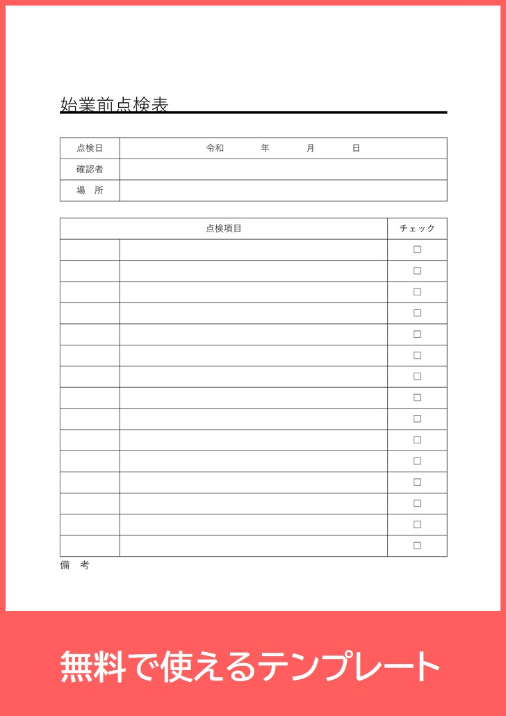 このテンプレートは印刷しやすいA4サイズで作成されているため、現場での点検作業にも使いやすいのが特徴です。点検項目を順番に確認しながら記入できる構成になっており、機械の状態や安全確認を効率よくチェックできます。
